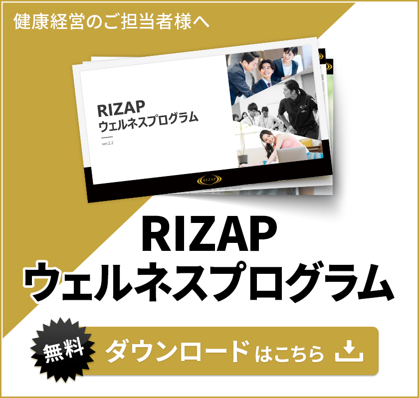 従業員の健康を推進するために、法人向けウェルネスプログラムサービスのすべてがわかる資料「RIZAPウェルネスプログラム」をお届けします。