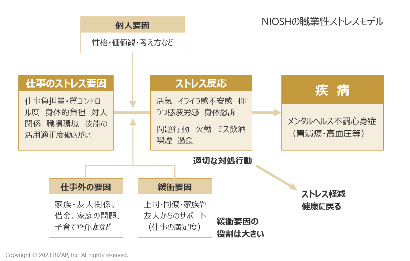 このモデルからもわかるように仕事のストレス要因の一つとして職場環境があげられており、職場環境を見直すことで従業員のストレスの軽減やメンタルヘルス対策につながることがわかります。