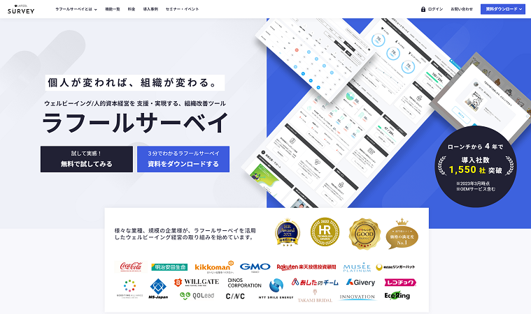 ラフールサーベイは株式会社ラフールが運営するサービスで、組織と働く個人の可視化と行動変容を促し、ウェルビーイング経営を実現する組織改善サーベイです。