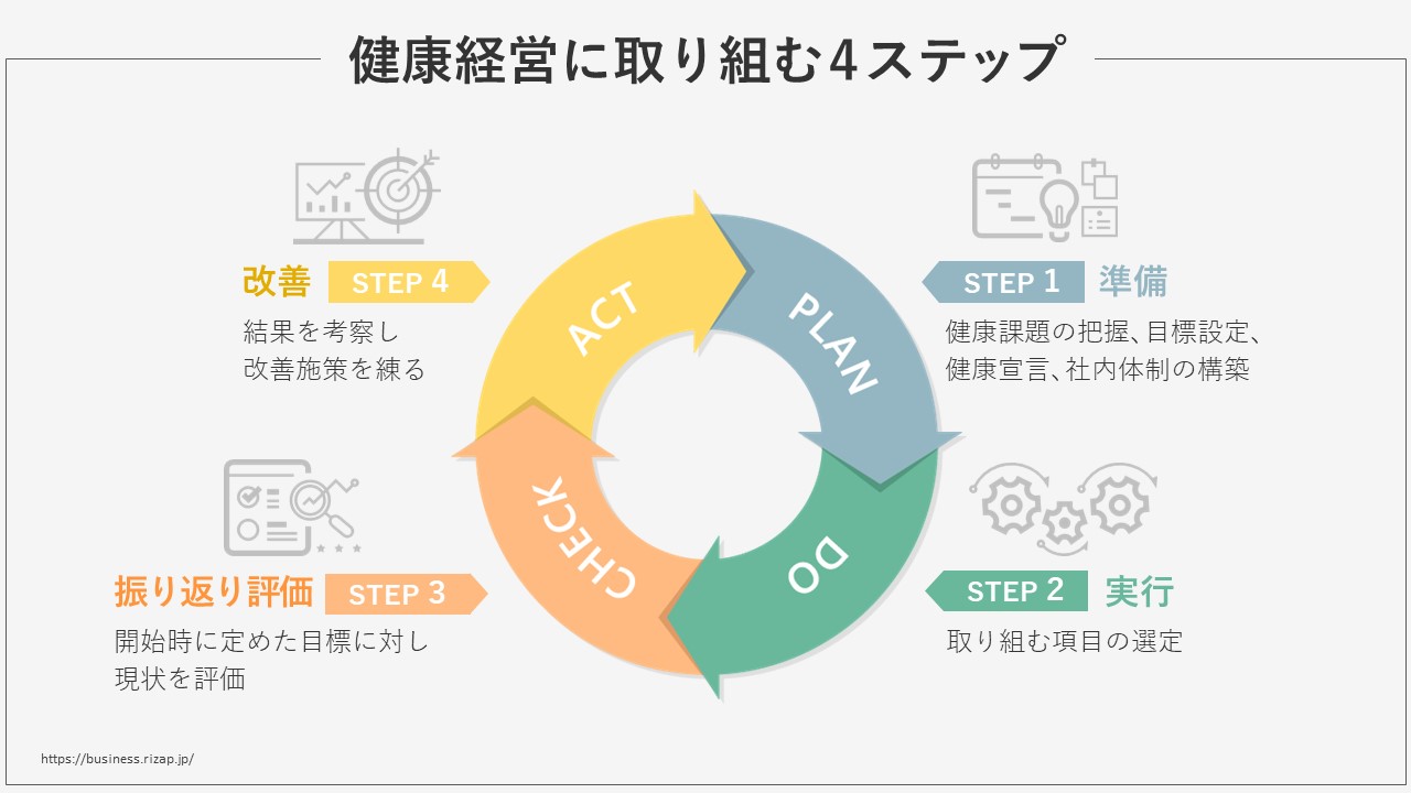 健康経営と聞くと、取り組みが難しいのでは?と思う方もいるかもしれません。ここでは、4つのステップに分け、健康経営の取り組み方を解説していきます。