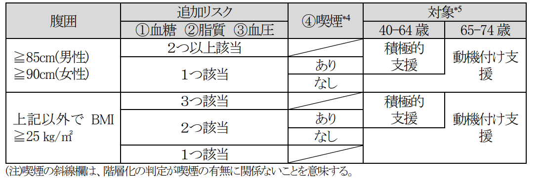 内臓脂肪の蓄積度合い、リスク要因の数などから保健指導の対象者を選び、動機付け支援や積極的支援など、必要に応じた保健指導を行うことが目的です。