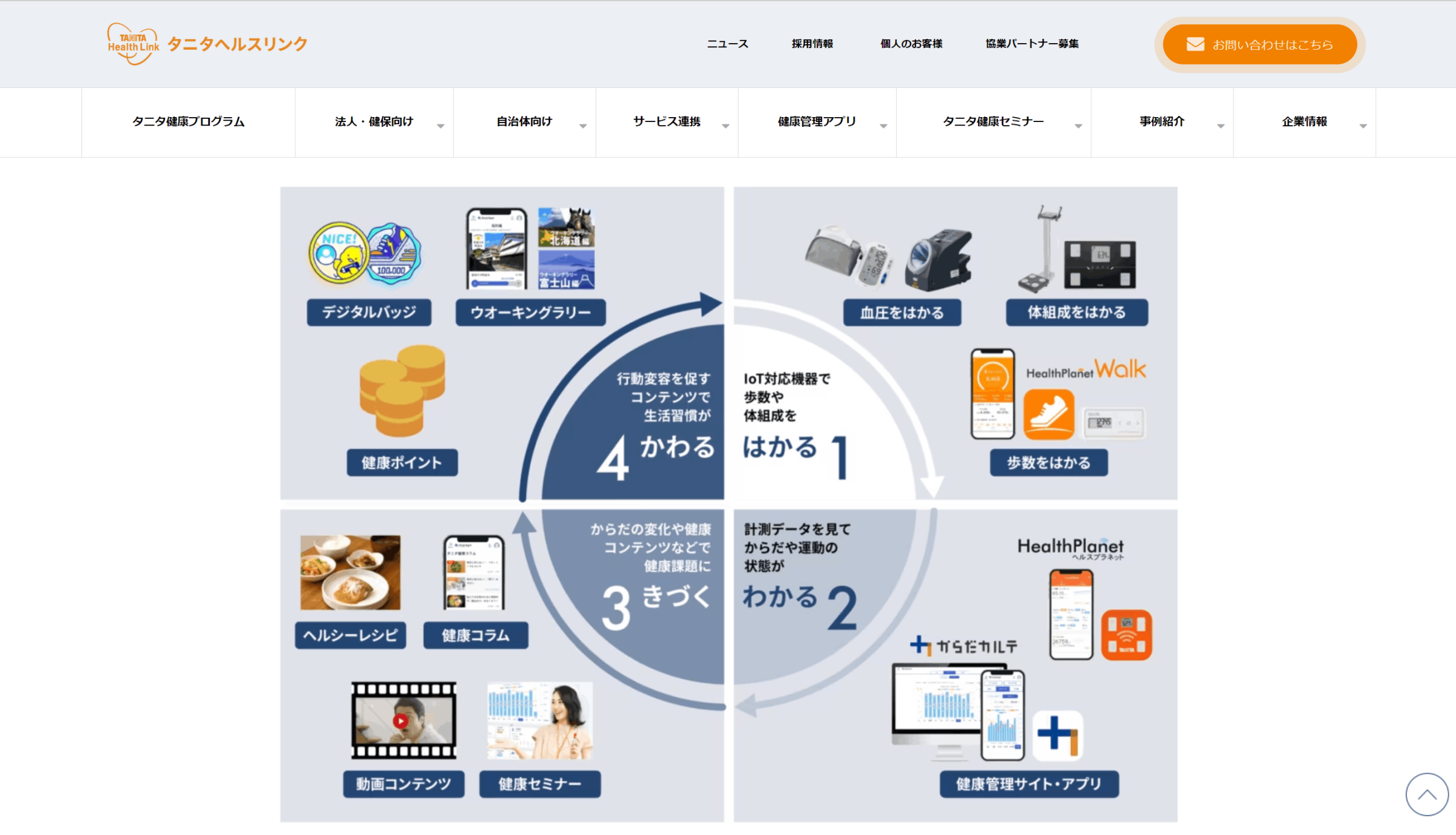 株式会社タニタヘルスリンクが運営するタニタ健康プログラムは、「はかる→わかる→きづく→かわる」という健康を作るためのPDCAサイクルが回るように展開していることが特徴です。多くの人は知識として理解していても、かなか行動に移すことが難しいため、特に「かわる」の部分を重視しています。また内容をカスタマイズすることも可能なので、自社の課題に合わせたプログラムにもできます。