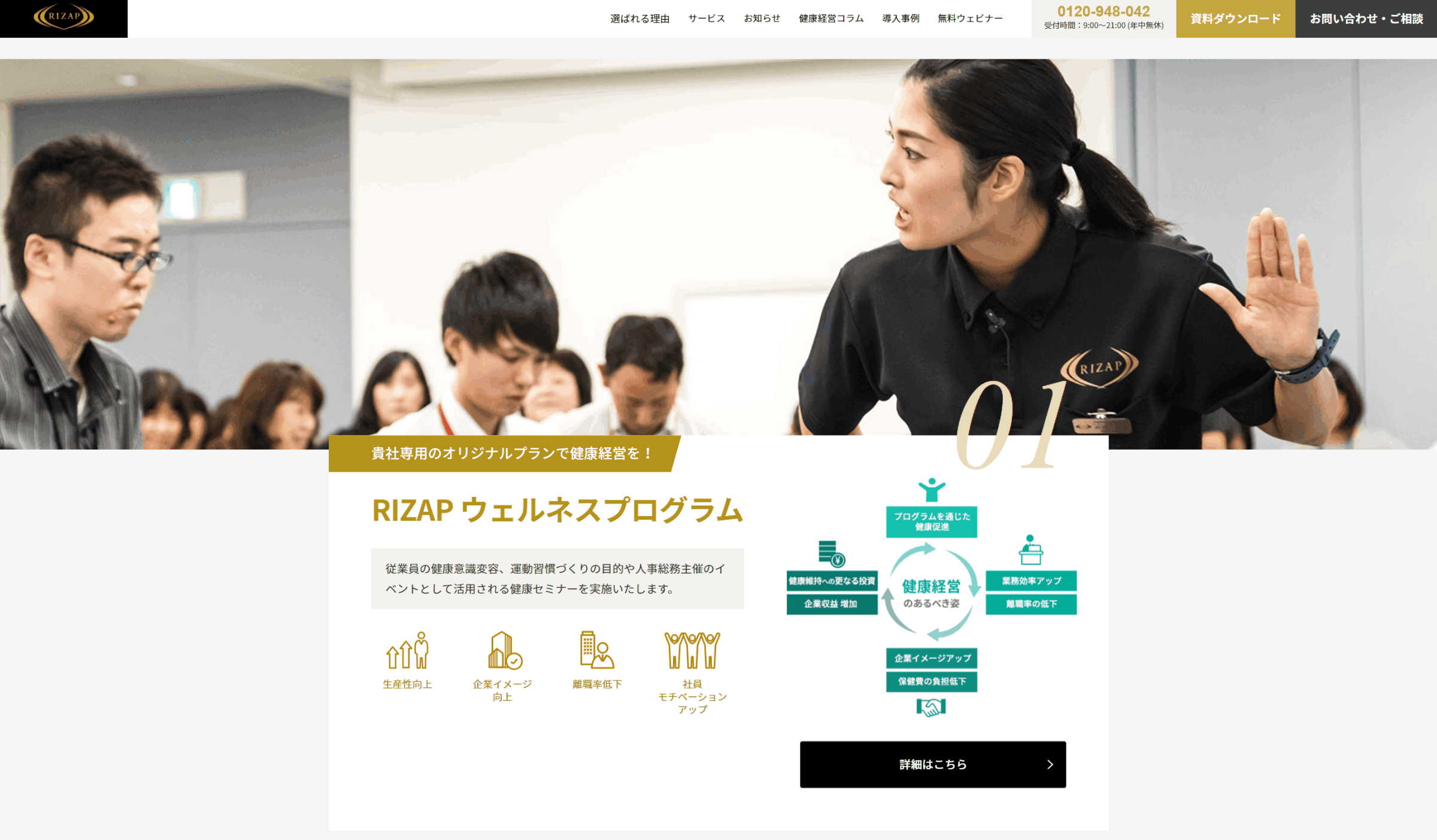 RIZAPウェルネスプログラムとは、RIZAPグループ株式会社が運営する法人向けの健康経営実現プログラムで、目的や環境に合わせたアプローチで健康経営にコミットしています。参加型プログラムだけでなくコラム等の配信プログラムも用意されており、RIZAPメソッドで健康経営への第一歩をサポートしています。