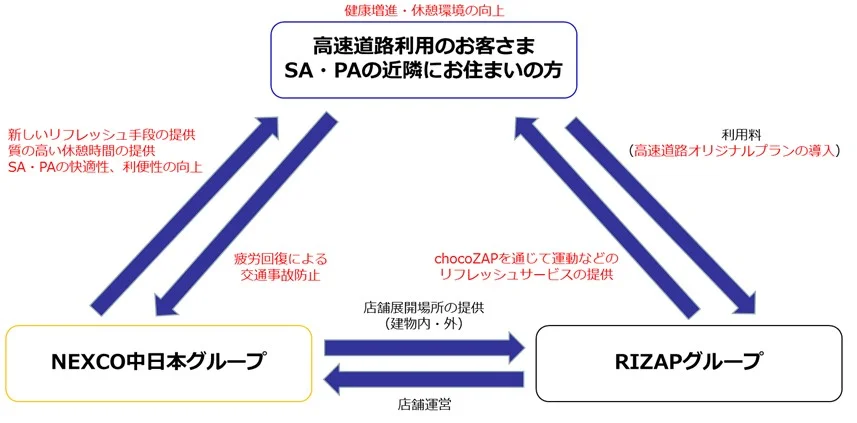 NEXCO中日本(本社・名古屋市中区、代表取締役社長CEO・小室(こむろ)俊二(としじ)と中日本エクシス(本社・名古屋市中区、代表取締役社長・三宅(みやけ)広通(ひろみち)は、RIZAPグループ株式会社(本社・東京都新宿区、代表取締役社長・瀬戸(せと)健(たけし)とその連結子会社であるRIZAP株式会社(本社・東京都新宿区、代表取締役社長・瀬戸健 以下、ライザップ社)と連携協定を、本日2月7日(水)に締結し、サービスエリア(SA)やパーキングエリア(PA)の新サービスとして、コンビニジム「chocoZAP(チョコザップ)」を設置することに合意しました。高速道路で初となる1号店は、E1東名高速道路(東名)日本平PA(上り)に2024年5月頃のオープンを目指します。