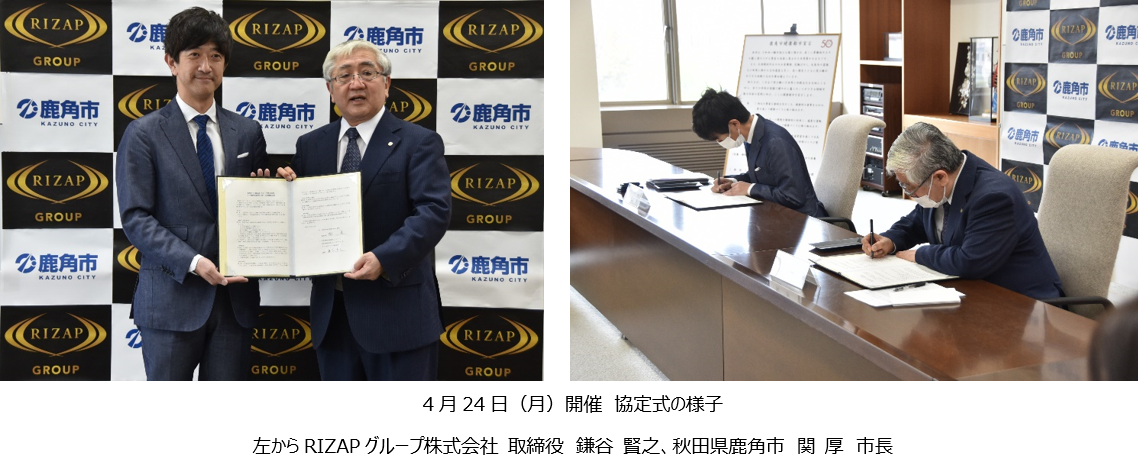RIZAPグループ株式会社(代表取締役社長 瀬戸 健、本社:東京都新宿区、以下「RIZAPグループ」)は、秋田県鹿角市(市長 関 厚、住所:秋田県鹿角市)と連携協定を4月24日に締結しましたのでお知らせいたします。東北地方の自治体との初の連携協定になります。