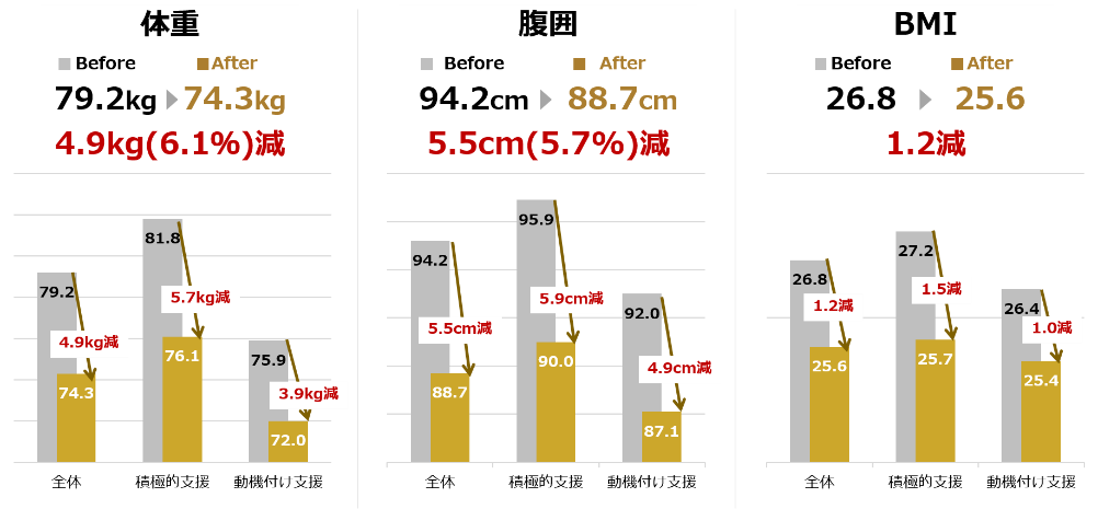 今年4~9月にRIZAP特定保健指導プログラムを終了した174名のうち96.6%※3が、開始時よりも修了時に体重が減少しており、平均4.9kg減※3 (平均6.1%減※3)に成功しました。さらに、昨年度トライアル実施した44名のうち、翌年度の階層改善率は81.8%※2であり、脱却率※4は68.2%※2という好結果を得ることができました。