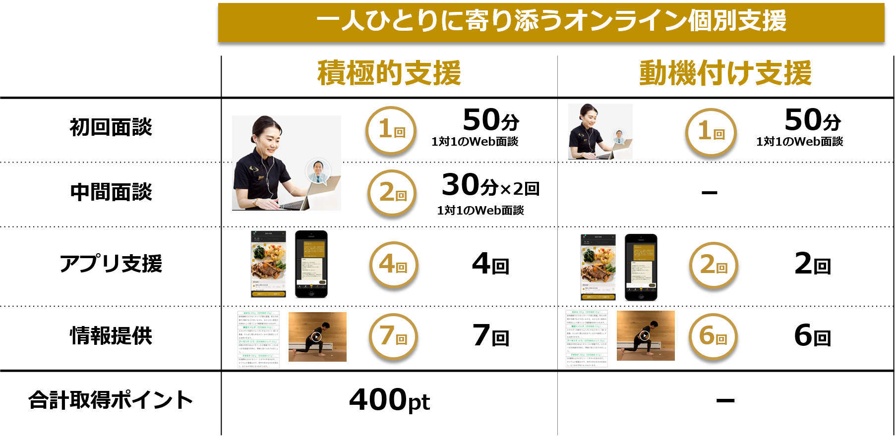 「食事、運動、メンタルサポート」を軸とするRIZAPメソッドを熟知している保健師・管理栄養士等のトレーナーが一丸となって対象者の生活習慣の改善をサポートすることで、結果を追求するプログラムです。ウィズコロナ時代に即して、ICT(情報通信技術)を活用した非対面形式にて、「積極的支援」および「動機付け支援」を提供しています。