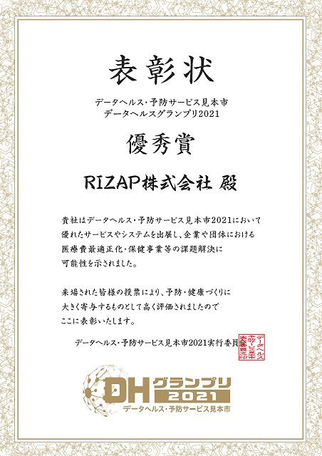 「RIZAP」)は、2021年11月30日~12月2日に開催された、厚生労働省主催の展示会「データヘルス・予防サービス見本市2021(以下「見本市」)」にて、RIZAP特定保健指導プログラムを出展し、データヘルスグランプリにて優秀賞を受賞したことをお知らせいたします。
