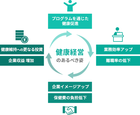 従業員の健康増進が生産性向上や離職率低下につながり、ひいては企業のイメージアップや業績向上へとつながっていきます。